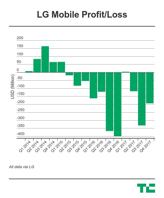 LG Mobile has posted just one quarter of profitability over the last two years, that was a small $3.2 million profit Q1 2017, the first quarter of sales of its G6 flagship. Previous to that, you have to go way back to Q1 2015 to find a positive quarter for its mobile division.
