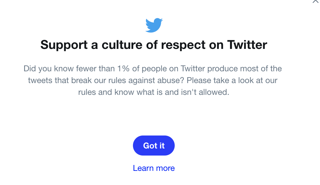 “We’re collaborating with a group of academic researchers and scholars led by Susan Benesch, J. Nathan Matias, and Derek Ruths on an initiative to remind people of the Twitter Rules, to evaluate whether increased awareness of our policies results in improved behavior and more respect on Twitter,” a Twitter spokesperson said in a statement.
