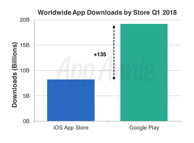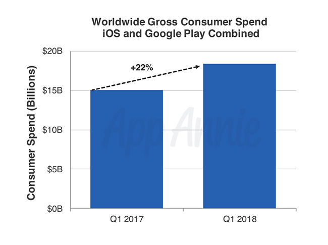 Global app downloads and consumer spending in apps had yet another record quarter, according to a new report from App Annie, out on Monday. In the first quarter of 2018, iOS and Google Play downloads grew more than 10 percent year-over-year to reach 27.5 billion – the highest figure to date. In addition, consumer spending on iOS and Google Play grew 22 percent year-over-year to reach $18.4 billion – also a record number.