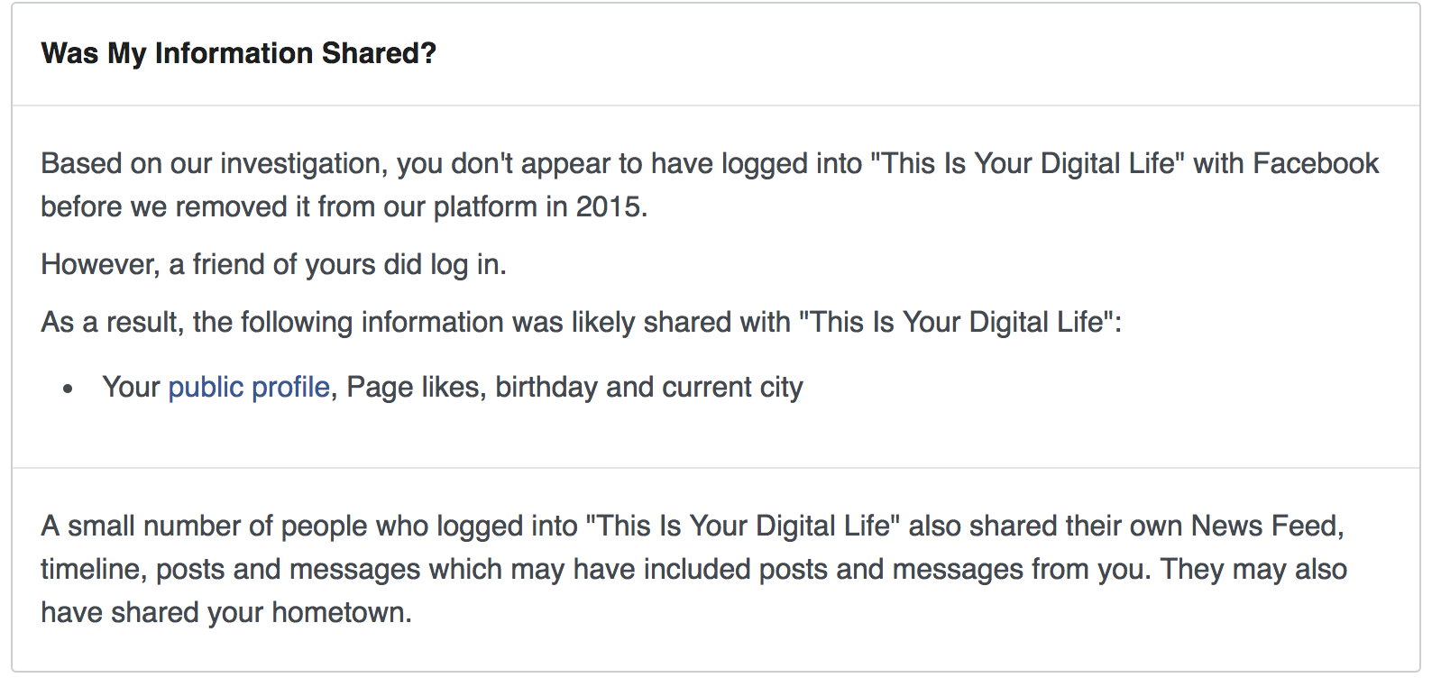 That messages may have been collected by CA was revealed first by Facebook itself as part of its warning issued to the 87 million users in question. “A small number of people who logged into ‘This Is Your Digital Life’ also shared their own News Feed, timeline, posts and messages which may have included posts and messages from you,” reads the warning.