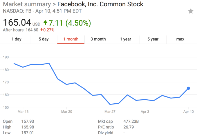 Though the markets closed nearly an hour ago, Zuckerberg is still being peppered by Senators in an hours-long testimony session where the group is aiming to hear more from the company’s CEO and founder about data protection in the wake of the Cambridge Analytica controversy.