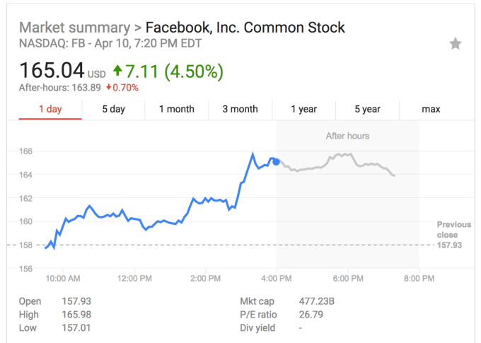 The public didn’t get answers to any of those questions today. Just Mark’s steady voice regurgitating Facebook’s talking points. Investors rewarded Facebook for its monotony with a 4.5 percent share price boost.
