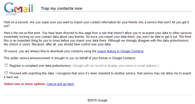 Google didn’t want to stop users from legitimately exporting their contacts, so it just put up a strongly worded warning to Gmail users: “Trap my contacts now: Hold on a second. Are you super sure you want to import your contact information for your friends into a service that won’t let you get it out? . . . Although we strongly disagree with this data protectionism, the choice is yours. Because, after all, you should have control over your data.” And Google offered to let you “Register a complaint over data protectionism.”