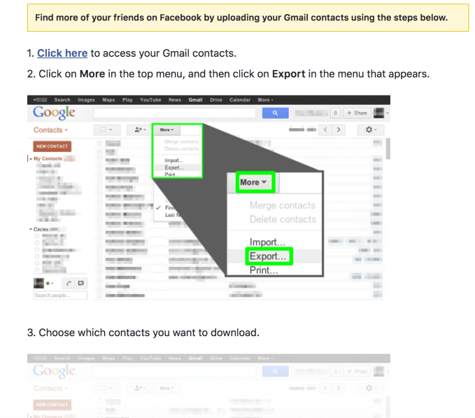 So did Facebook back off? No. It built a workaround, giving users a deep link to download their Gmail contacts from Google’s honorable export tool. Facebook then painstakingly explained to users how to upload that file so it could suggest they friend all those contacts.