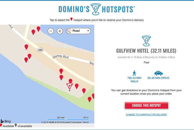 Domino’s will now deliver your pizza to the beach — well, sort of! Or the park, the sports field, that one gas station down the road or some notable landmark in your city where it will be easy for your delivery driver to find you, among other places. The company announced today the launch of more than 150,000 “Domino’s Hotspots,” which are locations that don’t have a traditional delivery address, like a home or business address. Instead, hotspots are just places where customers can meet up with their driver to accept a delivery order when they’re not at home or work.