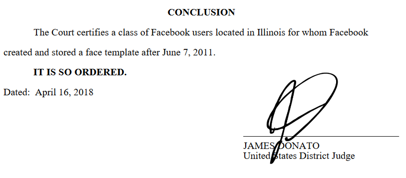 Lastly and most absurdly, Facebook argued that to establish legitimacy it would be necessary to check which users’ face templates were derived from scans of printed photographs instead of natively digital shots. “This too is unavailing,” says Donato, citing a total lack of evidence presented by Facebook.