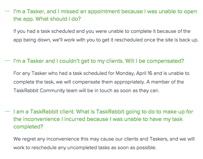 In response to a request for more information, TaskRabbit sent TechCrunch a statement that said active tasks will be rescheduled and taskers compensated for lost work. It also updated its landing page with a FAQ for users and taskers who unable to complete assignments today while the app is down: