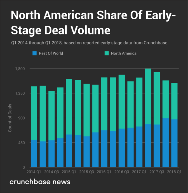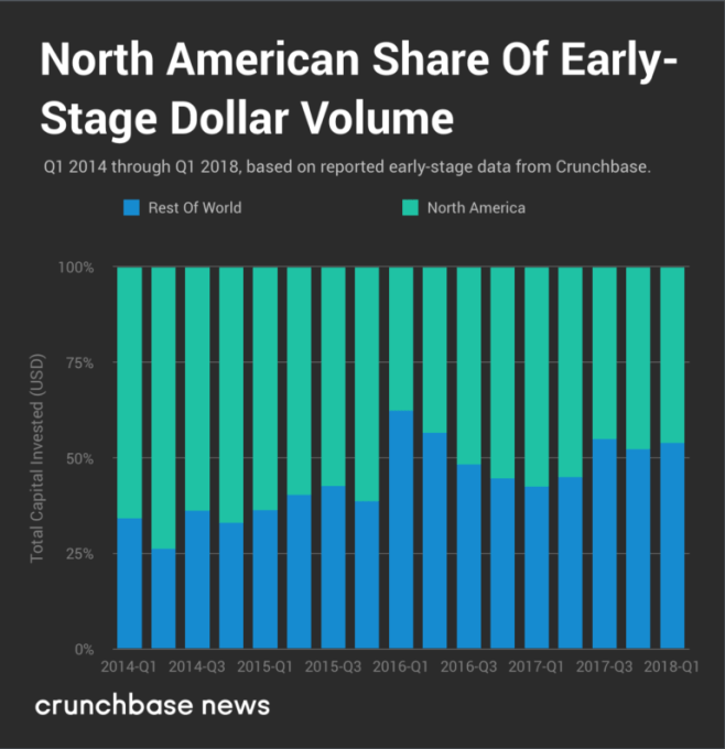 But while overall investment is on the rise, the U.S.’ share is dwindling. A few years ago, North American startups reliably received at least two-thirds of global early-stage investment. No more. For the past three quarters, North America’s share has dwindled to less than half, as the chart below illustrates: