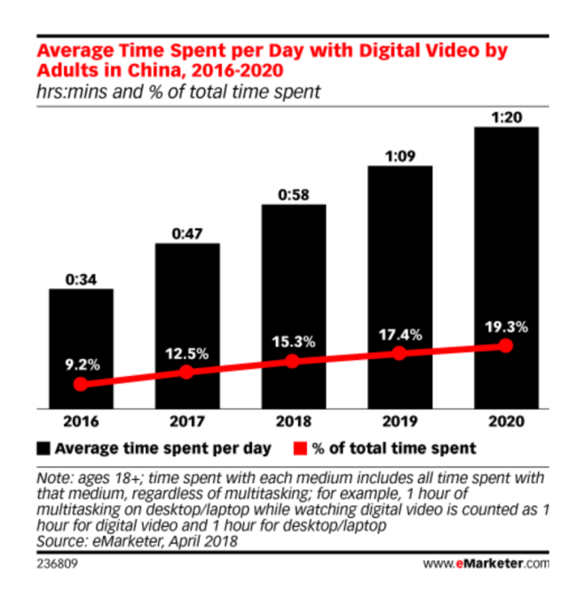 The growth of digital video services is “a key driver” in this change, eMarketer said. The company forecasts that online video time per day will leap 26 percent year-on-year to reach 58 minutes per adult on average. It is further predicting that by 2020, China’s adult population will spend one-third of their time online watching videos.