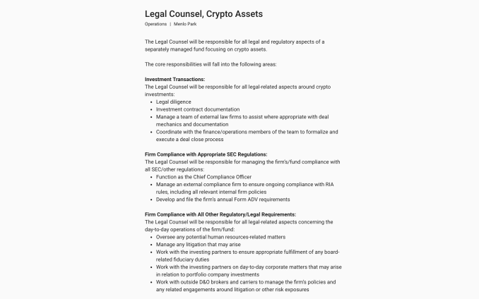 One for a ‘Finance and Operations Manager, Crypto Assets‘ and another for a ‘Legal Counsel, Crypto Assets‘ explicitly detail that the firm is planning “a separately managed fund focusing on crypto assets.” The legal role itself includes “compliance with appropriate SEC regulations,” and in particular “managing the firm’s/fund compliance with all SEC/other regulations,” while the operations manager is tasked with the challenging job of valuing crypto assets among other responsibilities.