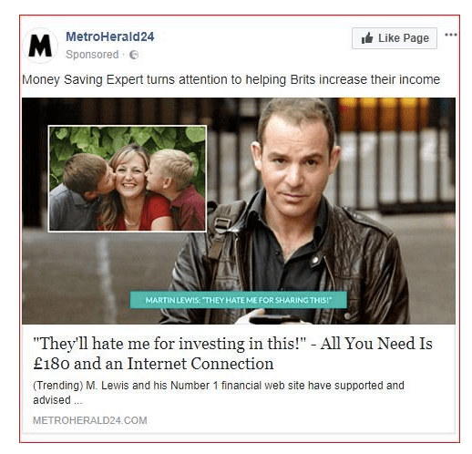 In January Facebook revised its ads policy to specifically ban cryptocurrency, binary options and initial coin offerings. But as Lewis’ samples show, the scammers are circumventing this prohibition with ease — using Lewis’ image to drive unwitting clicks to a secondary offsite layer of fake news articles that directly push people towards crypto scams.