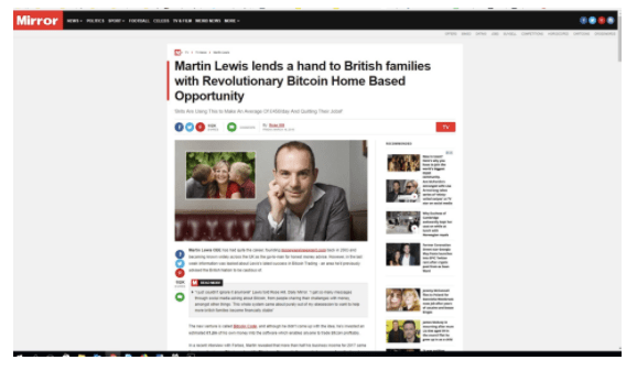 And here’s the fake news article it links to — touting a “revolutionary” Bitcoin opportunity, in a news article style mocked up to look like the Daily Mirror newspaper…