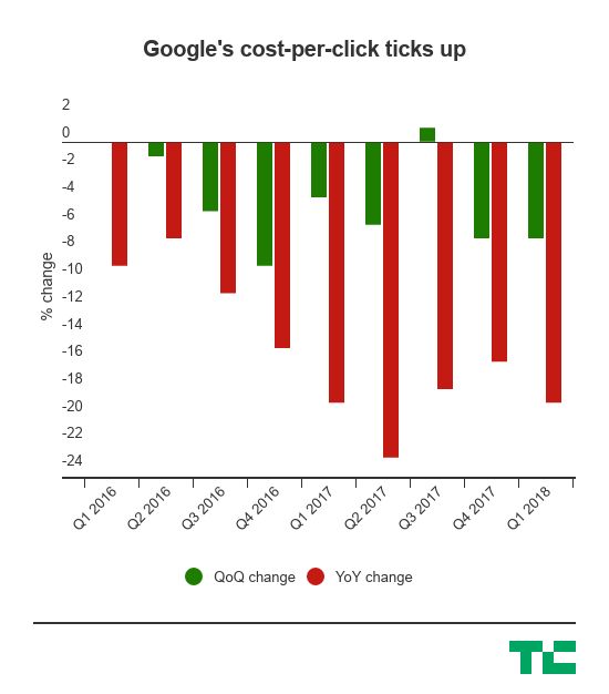 Google said its revenue grew 26% year-over-year to $31.16 billion in the first quarter this year. In the first quarter last year, Google said its revenue had grown 22% between Q1 of 2016 and Q1 of 2017. All this is a little convoluted, but the end result is that Google is actually growing faster than it was just a year ago despite the continued trend of a decline in its cost-per-click — a rough way of saying how valuable an ad is — as more and more web browsing shifts to mobile devices. Last year, Google said it recorded $24.75 billion in the first quarter.