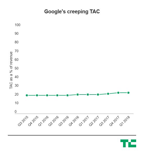 Google’s traffic acquisition cost, or TAC, appears to also remain stable as a percentage of its revenue. This is a little bit of a sticking point for observers for the company and a potential negative signal for investors as more and more web browsing shifts to mobile. It’s ticked up very slowly over the past several years, but is now sitting at around 24% of its total revenue.