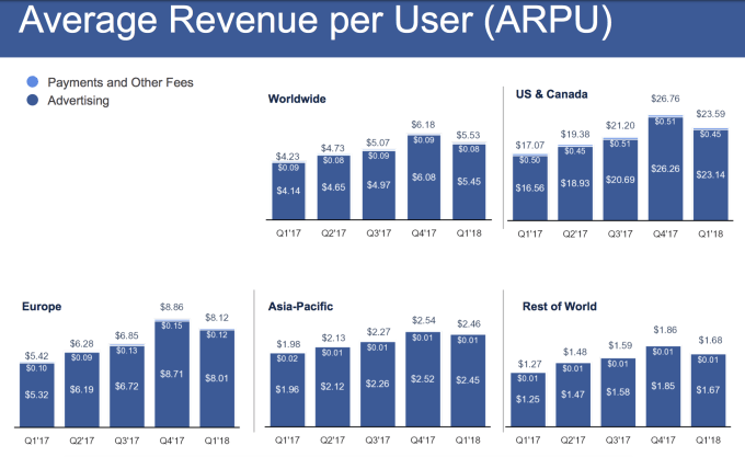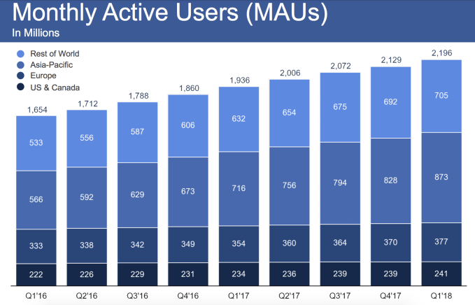 Facebook was able to revive its U.S. & Canada user growth this quarter, perking back up to 185 million, from 184 million last quarter — though that’s just a return to where it was in Q3 2017. Monthly active user count in the market went from 239 to 241 million. That shows that while people might disagree with Facebook’s approach to privacy, they aren’t about to give up their News Feeds.