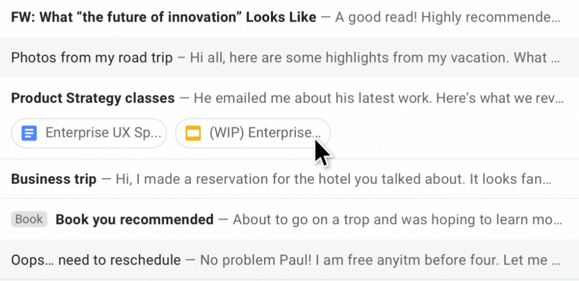 All of those new features are supported by the new design, which itself feels more like a refresh than a revolution. Like before, you can choose between three density settings: default, comfortable and compact. The default setting is the most interesting option because it comes with a new feature, too: attachment clips. Instead of simply showing you the standard paperclip in your inbox to signify that an email chain includes an attachment, the new Gmail now highlights the attachments right underneath the message preview in the inbox view.