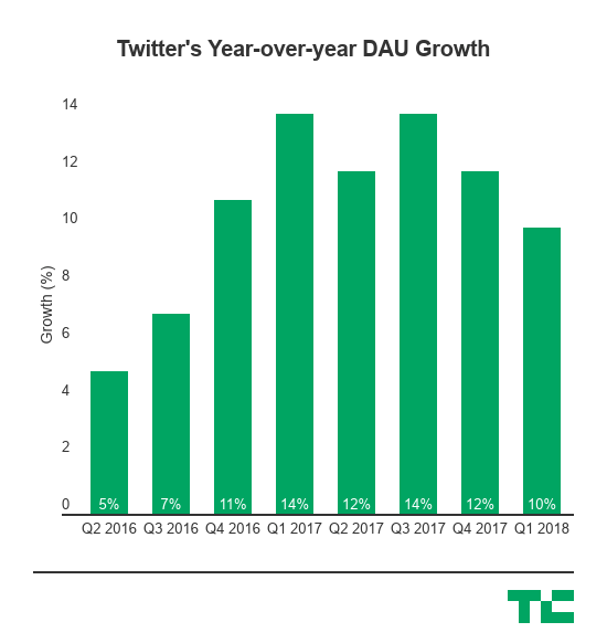 That’s also why Twitter loves to show this chart and talk about it on its quarterly earnings releases, which has only one of the two required axes in order to be a chart. The chart shows year-over-year daily active user growth, but the company doesn’t like to offer some kind of basis for how many of its users are actually super-active DAUs. But, nonetheless, here it is in all its glory: