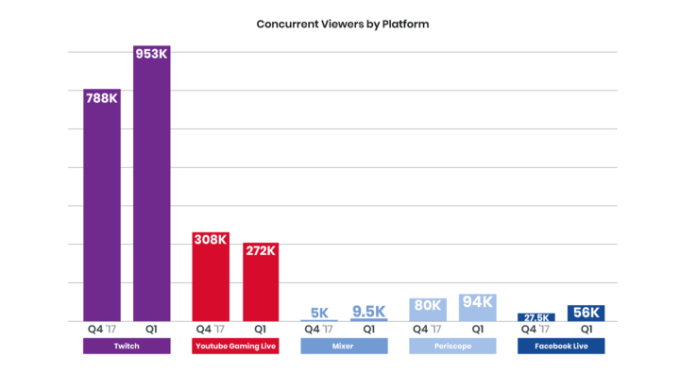 It also saw a 33 percent increase in average concurrent streamers in Q1, going from 27K to 36K. Mixer and Periscope gained as well, up 282 percent and 126 percent, respectively. But YouTube Gaming dropped by 13 percent on this metric, going from 8.7K average concurrent streamers in Q4 2017 to 6.1K in Q1.