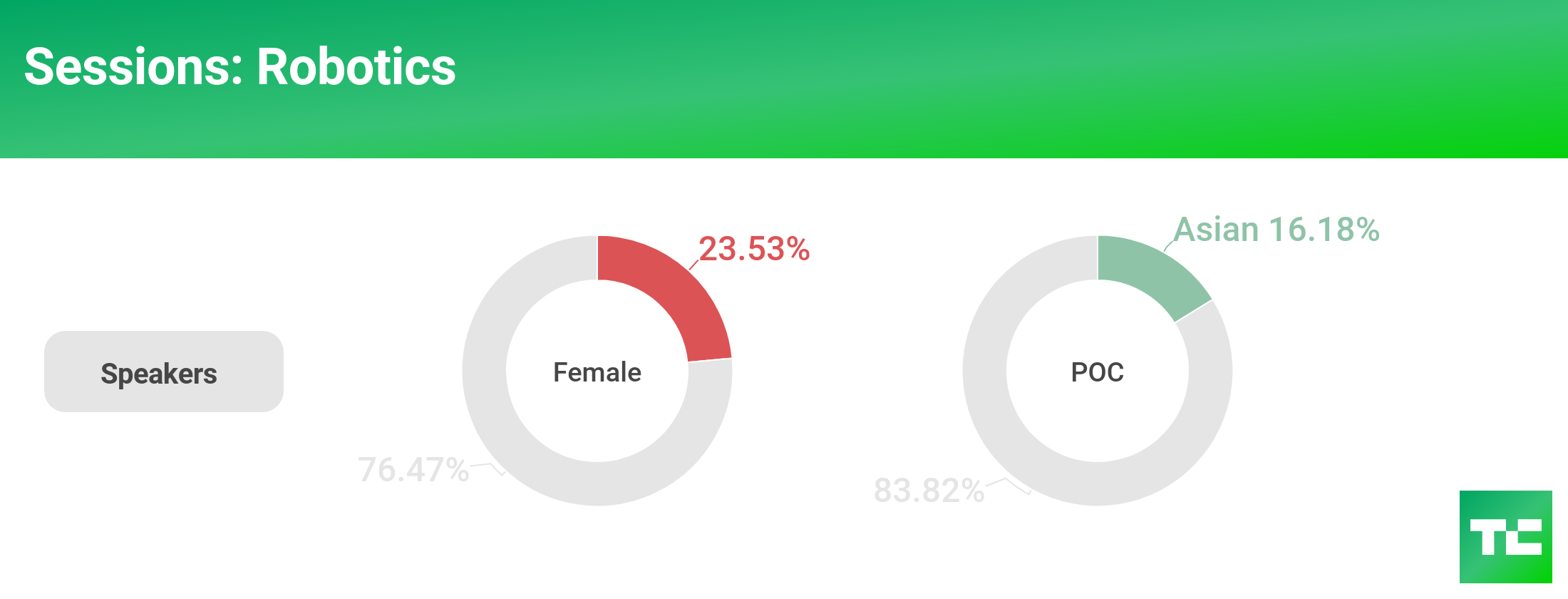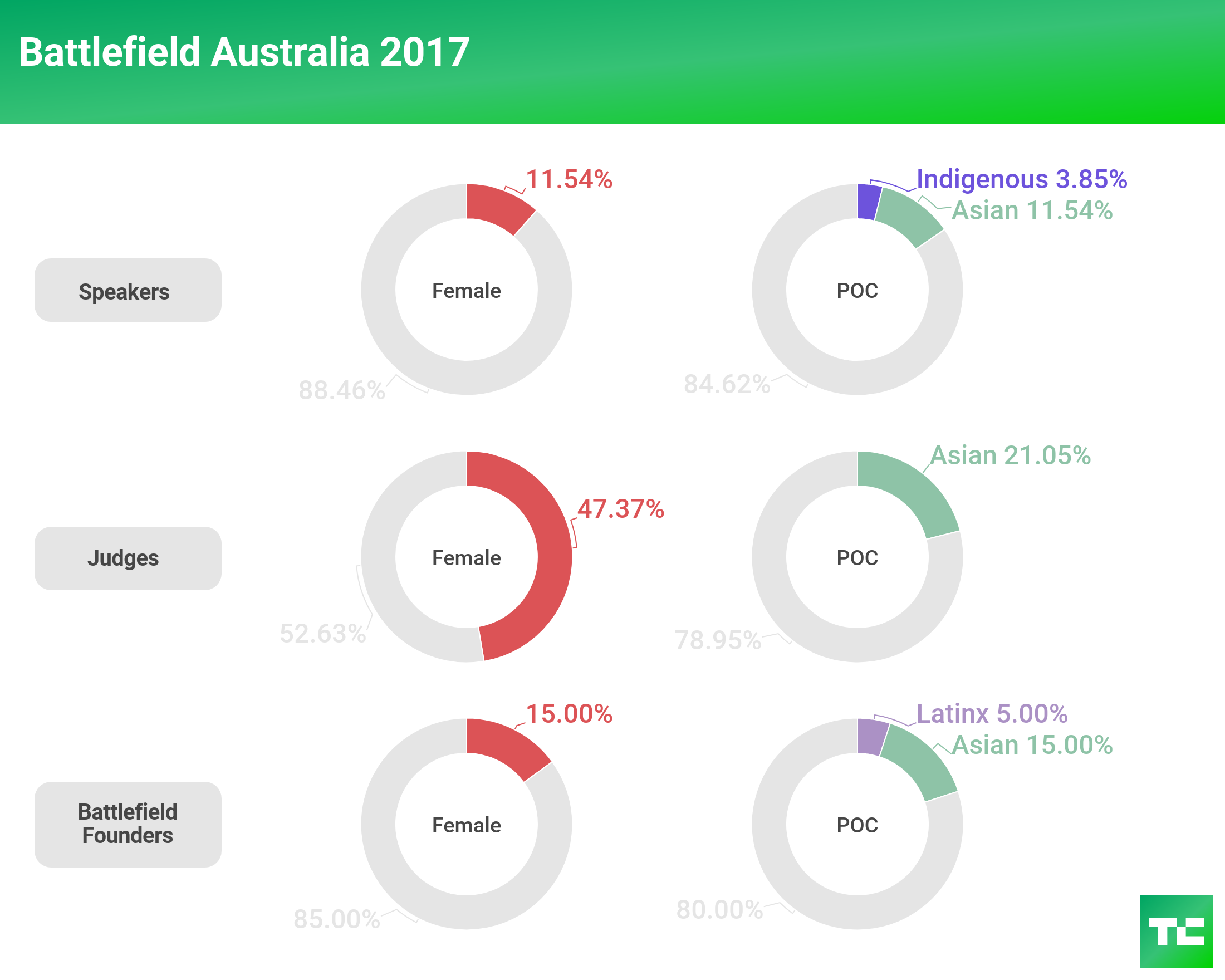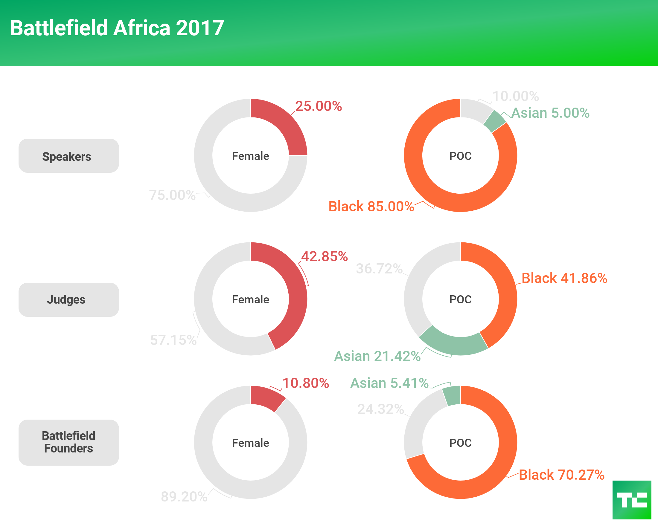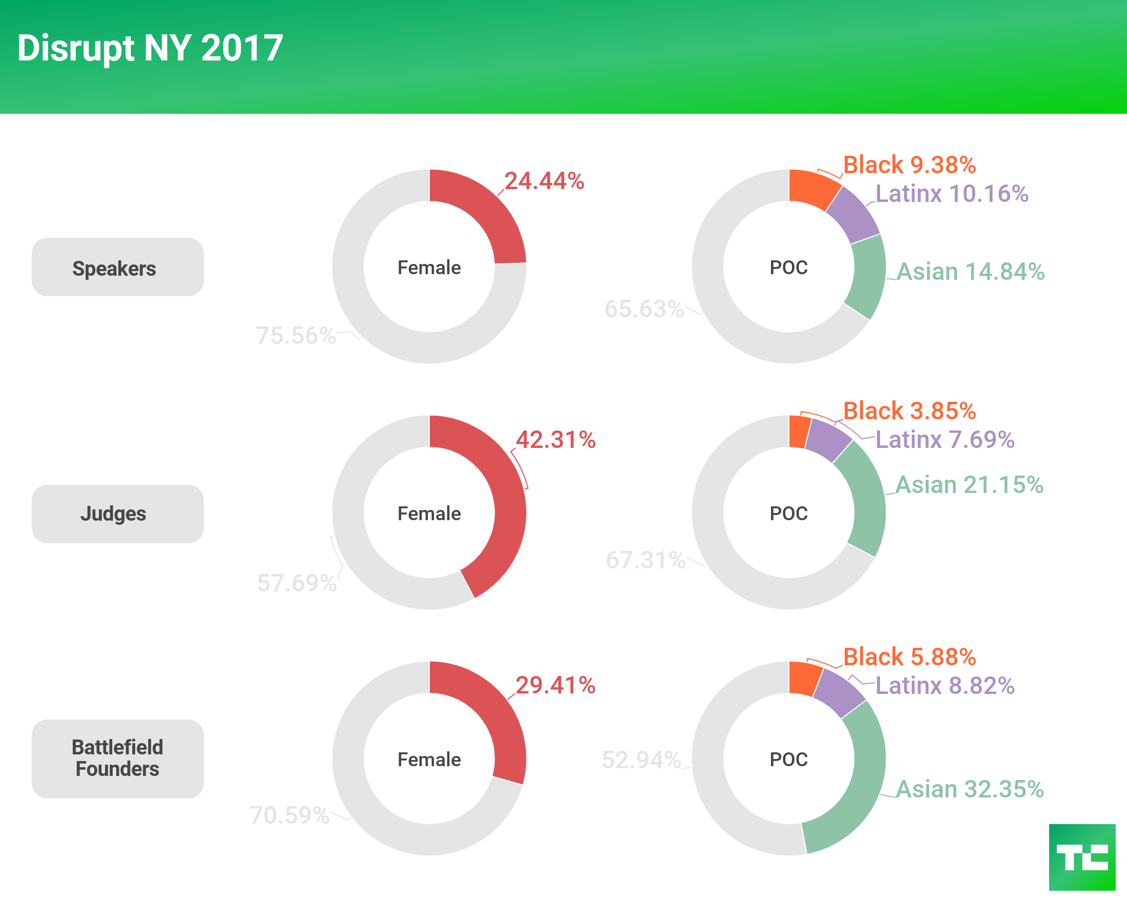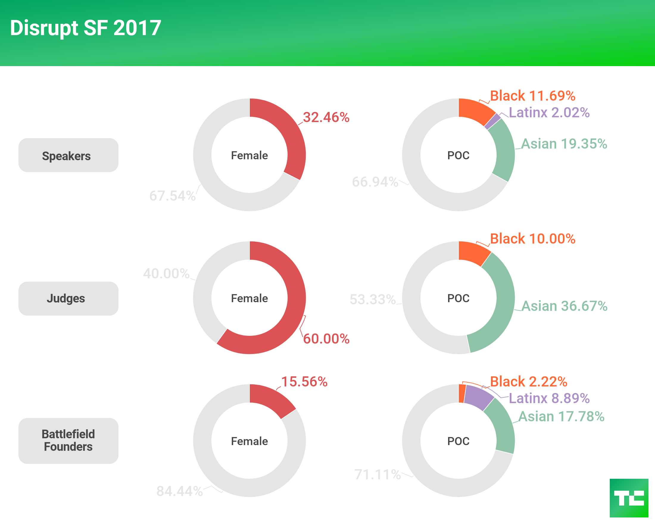 In 2017, we saw an improvement over 2016 with female representation onstage, with speakers increasing 12 percent and judges increasing 13 percent. However, female representation on the Battlefield founder front decreased almost 6 percent.