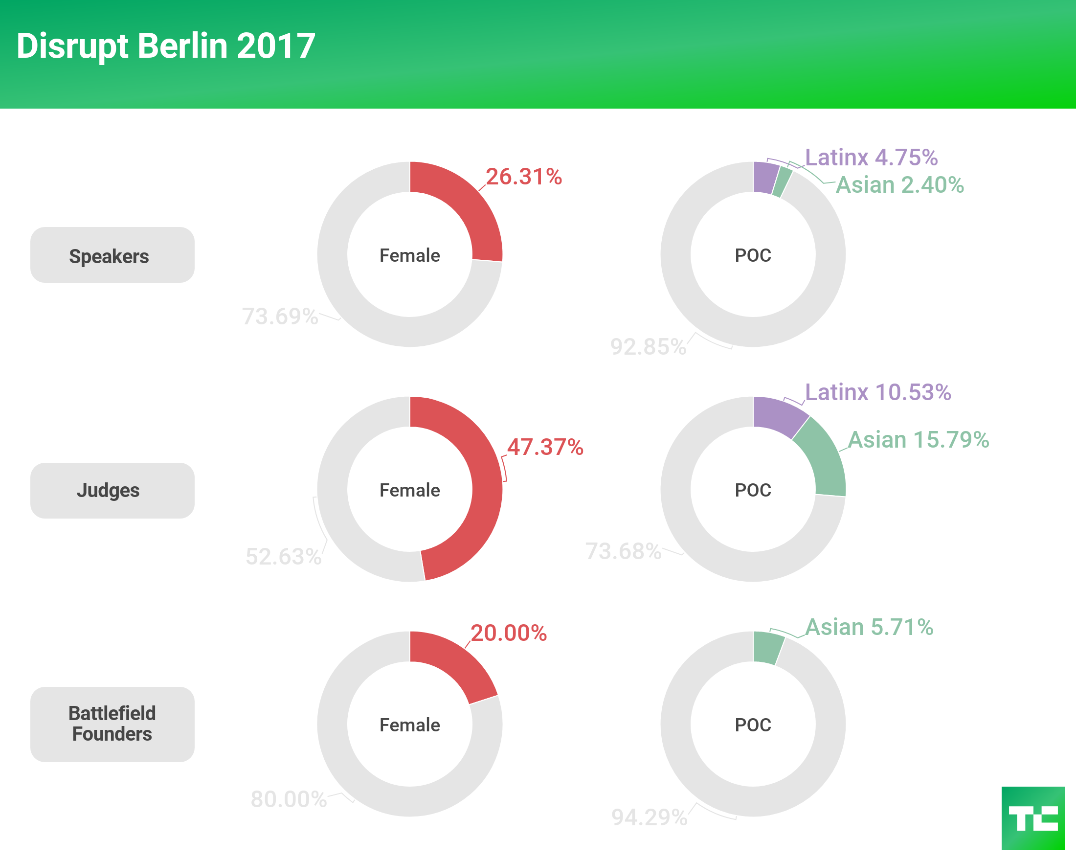 Disrupt returned to Berlin in December 2017 after three years in London. We saw a 14 percent increase in female judges onstage over 2016. But female speakers and Battlefield founders decreased year-over-year by about 3 percent and 12 percent, respectively.