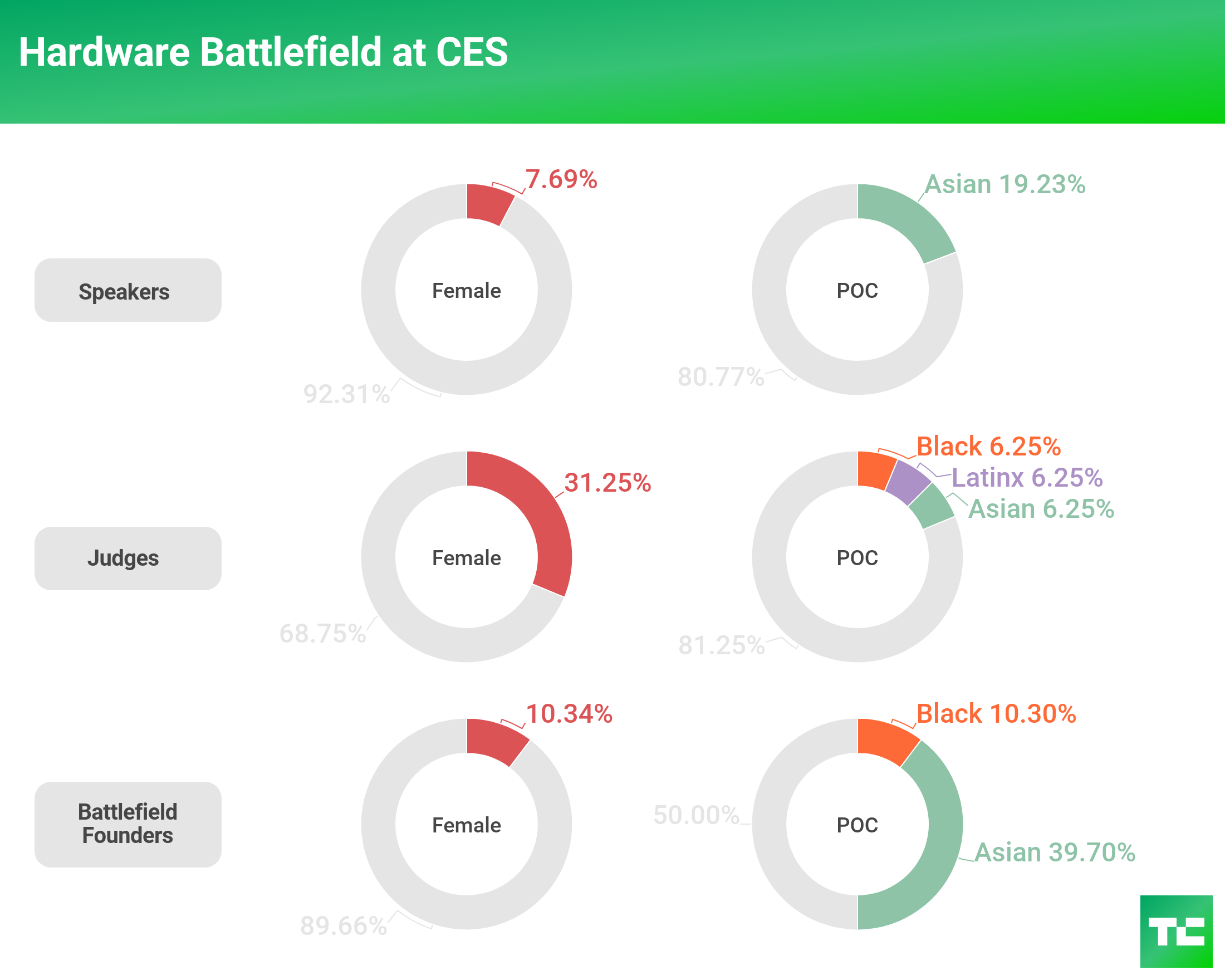 In January 2017, we once again hosted a Hardware Battlefield at CES. Female representation for speakers, judges and Battlefield founders were down slightly from 2016. By contrast, for the first time in a Hardware Battlefield, minority founders were represented equally, with 50 percent.