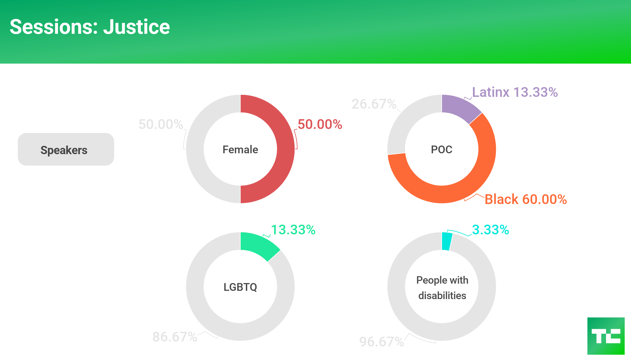 TechCrunch Sessions: Justice was the most racially inclusive event we’ve ever put on. That said, we could’ve done better with getting more Latinx speakers onstage. In addition, we collected statistics about gender and sexual orientation.