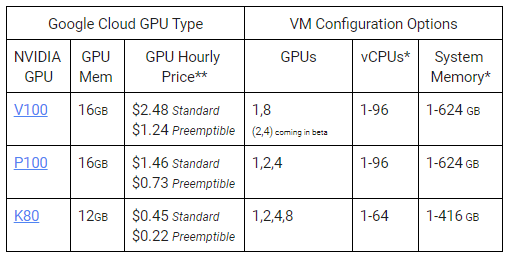 V100 machines are now available in two configurations with either one or eight GPUs, with support for two or four attached GPUs coming in the future. The P100 machines come with one, two or four attached GPUs.