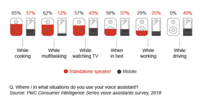 And the issue isn’t one of general awareness it seems. Adoption of voice technology across platforms – including phones, tablets, computers, speakers, wearables, TV remotes and cars – is being driven by younger consumers, says PwC, along with households with children, and those households with incomes of over $100,000.
