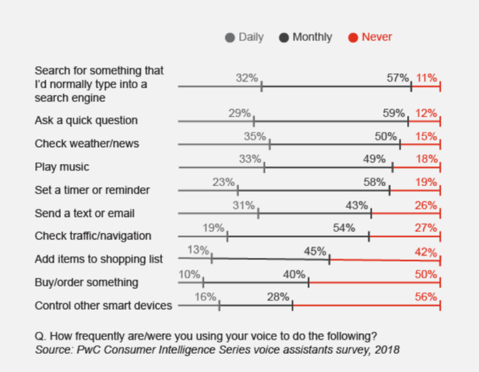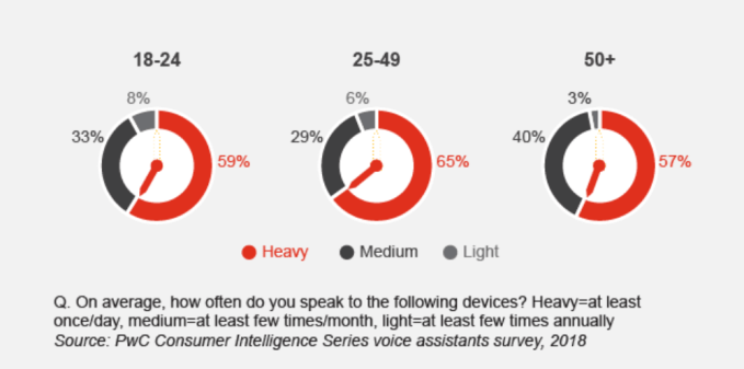 Here’s an odd juxtaposition for you. According to a new report on voice assistants released today by PwC, younger users are adopting voice technology at a faster rate than their older counterparts, but are somehow using their voice assistants less often. The report found that users 18 through 24 had fewer “heavy” users of voice technology, compared with those 25 to 49, and 50 or older.