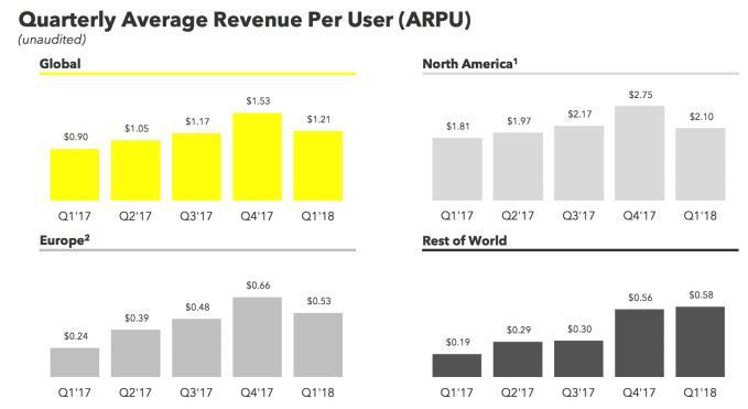 Snap also saw an unprecedented decline in its average revenue per user in North America. It’s standard for the holiday Q4 to rake in more cash than the following Q1. But Snap’s ARPU in the US and Canada slipped to $2.10, down from $2.75 in Q4, but also down from $2.17 in Q3. That indicates serious problems monetizing that could be due to fewer Stories or Discover ad views during Q1.