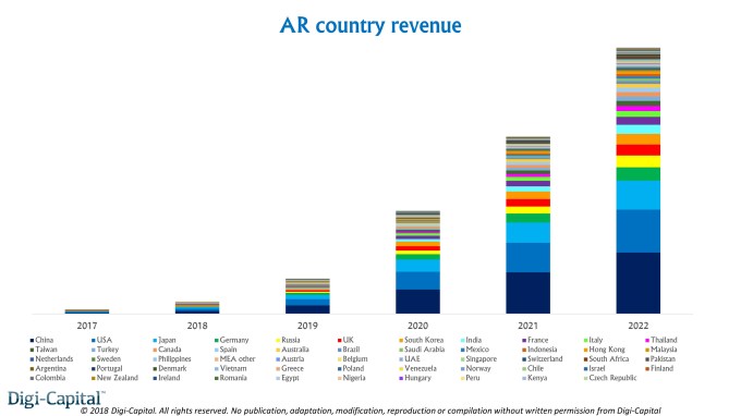 Combining China’s impending AR installed base, business models and economics, and it could see nearly one-quarter of all AR revenues globally by 2022. This is almost half again what the U.S. might produce in a similar time frame. Merging all the country data for a regional view, and Asia could take more than half, Europe less than one-quarter and North America less than one-fifth of global AR revenues.