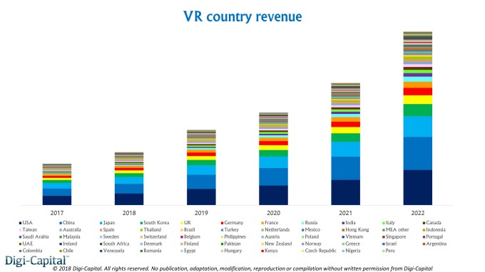 The U.S. could take around one-fifth of global VR revenue by 2022, making it slightly larger than China. But while the U.S. could win the VR battle, it might be a small victory. Combining China with other countries in the region (particularly Japan and South Korea), Asia could deliver just under half of global VR revenue in five years — over twice North America. Europe (led by the U.K., Germany, France) could also deliver, but the European region combined might only be slightly larger than either the U.S. or China individually.