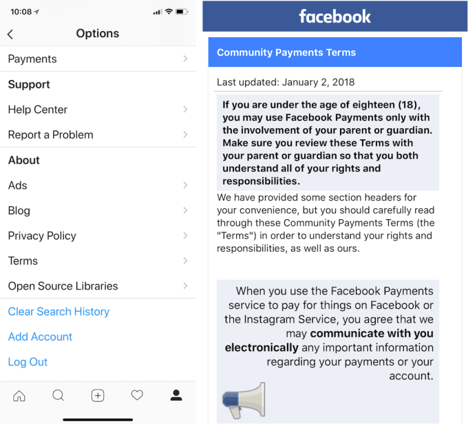 We’ve confirmed that the payment settings are now visible; some, but not all, users in the U.S. have it while at least some in the U.K. don’t. A tap through to the terms of service reveals that Instagram Payments are backed by Facebook’s Payments rules.