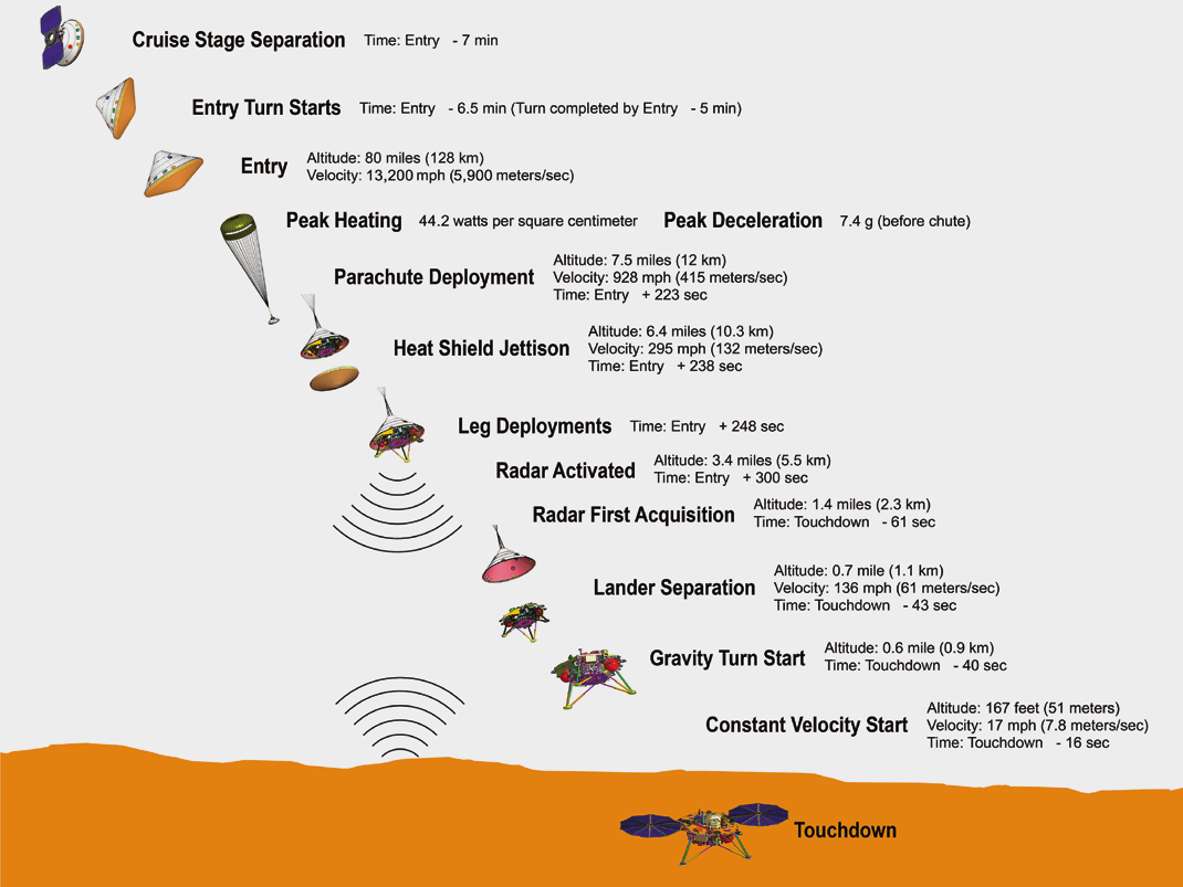Its landing will be as exciting (and terrifying) as Phoenix’s and many others. When it hits the Martian atmosphere, InSight will be going more than 13,000 MPH. It’ll slow down first using the atmosphere itself, losing 90 percent of its velocity as friction against a new, reinforced heat shield. A parachute takes off another 90 percent, but it’ll still be going more than 100 MPH, which would make for an uncomfortable landing. So a couple thousand feet up it will transition to landing jets that will let it touch down at a stately 5.4 MPH at the desired location and orientation.