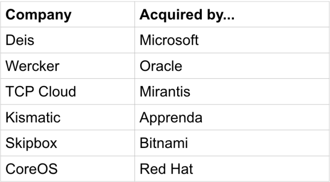 CoreOS wasn’t alone by any means as we’ve seen other exits coming over the last year or two with organizations scooping up cloud native startups. In particular, when you see the largest organizations like Microsoft, Oracle and Red Hat buying relatively young startups, they are often looking for talent, customers and products to get up to speed more quickly in a growing technology area like Kubernetes.