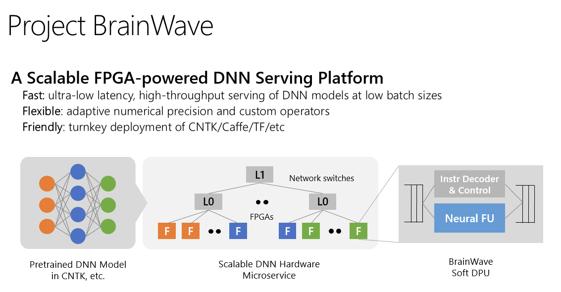 Last August, the company first detailed some aspects of Brainwave, which consists of three distinct layers: a high-performance distributed architecture; a hardware deep neural networking engine that has been synthesized onto the FPGAs; and a compiler and runtime for deploying the pre-trained models.