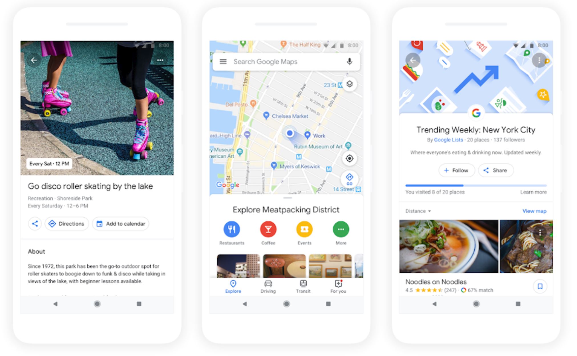 The first new feature to enable this is the ‘for you’ tab. This new part of Google Maps will learn from your personal preferences and tell you about what’s new in your neighborhood (or other neighborhoods you are watching). Maybe there’s a new cafe or restaurant.