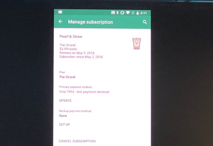 Google will address this with a new “subscription center” in Google Play, where users will be able to both explore new subscription apps to try, as well as manage their current subscriptions. Here, they can address issues like updating a payment method that’s expired, for example. Other new features will allow users to add a backup payment method to fall back on for those subscriptions that are critical — like your favorite streaming service, perhaps.