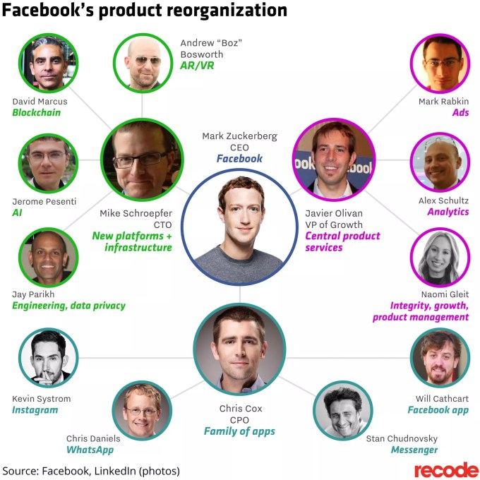 Chris Cox, Facebook’s chief product officer, will fly that flag. He now oversees the “Facebook Family of Apps,” including Facebook, Messenger, Instagram and WhatsApp. Messenger’s VP of Product Stan Chudnovsky will take over as head of Messenger, replacing David Marcus, who’s moving to lead a new blockchain group at Facebook (more on that later).