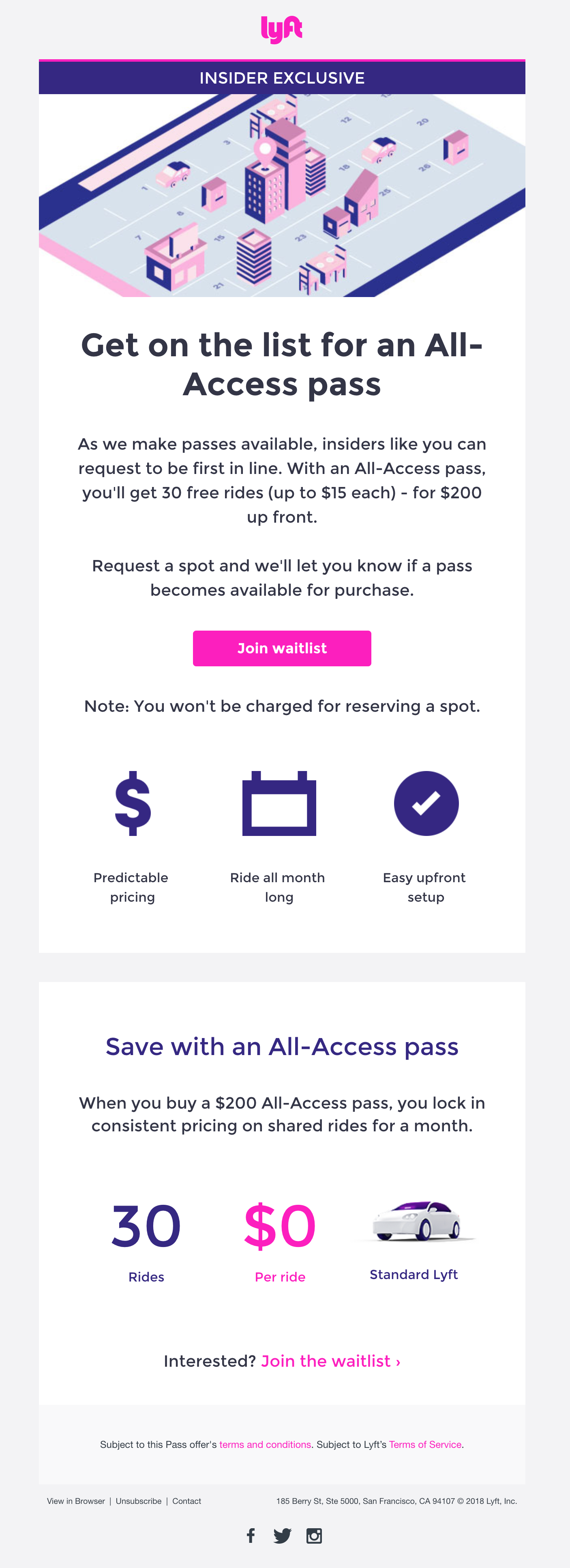 If selected from the waitlist, you’ll be able to buy a $200 pass in order to get $15 off 30 rides. That’s a savings of $250 if you were to take 30 $15 rides a month without the plan. Lyft isn’t disclosing the exact size of the test, but it’s going out to passengers nationwide.