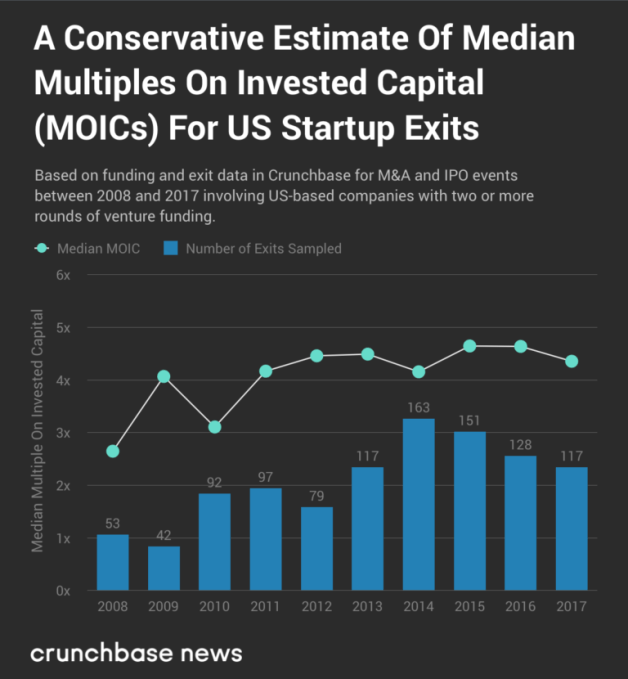 As it happens, that multiple on invested capital (MOIC) makes for a fairly decent heuristic for measuring company and investor performance. Most critically, it provides a handy metric to use for answering these questions: For US-based companies, have exit multiples changed in a meaningful way over time? And, if so, does this suggest something about the investment landscape overall?