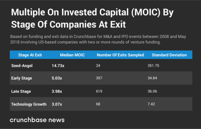 But it’s a finding that nonetheless echoes a prior Crunchbase News analysis, which found a slight but statistically significant inverse relationship between the amount of capital a startup raises and the multiple its exit delivers to investors and other stakeholders. In other words, startups that raise less money (such as those at seed and early-stage) tend to deliver better multiples on invested capital.
