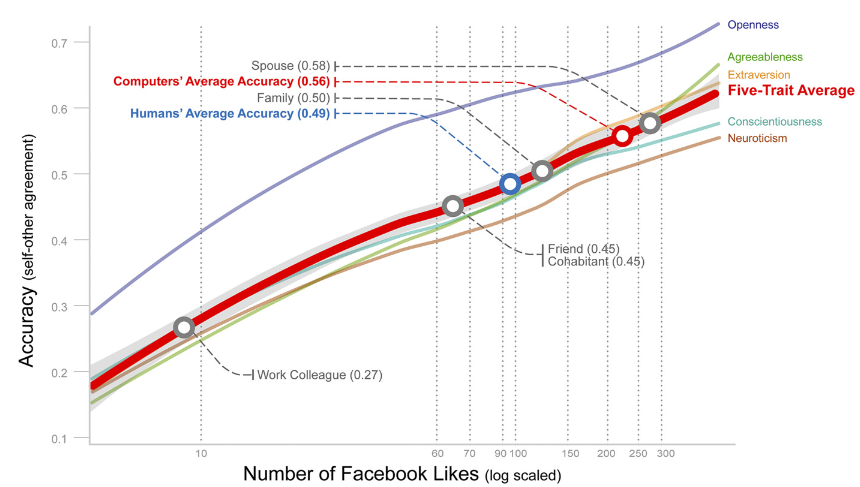 In a separate email, Michal Kosinski also emphasized the importance of the published research based on their data set. Here’s a recent example looking into how people assess their own personalities versus how those who know them do, and how a computer trained to do so performs.