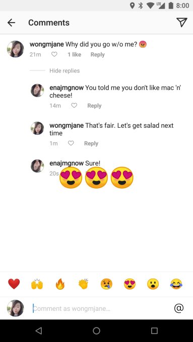 Several of Wong’s other recent discoveries of unlaunched features like Facebook Avatars and Twitter encrypted DMs were subsequently confirmed by the companies as being in testing. She also just spotted code revealing an new Instagram commenting interface with an Emoji Bar that let’s you add the most popular little icons with a single tap, and an @ button that reminds you to tag a friend.
