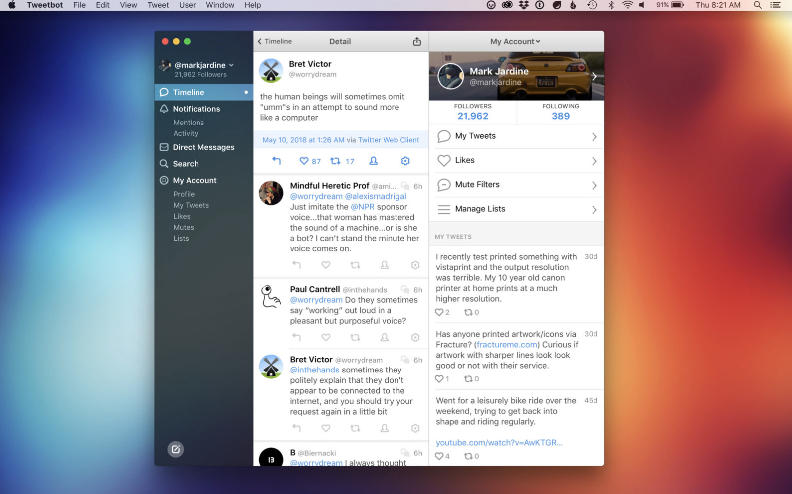 “Twitter has a replacement API that – if we’re given access to – we’ll be able to use to replace almost all of the functionality that they are deprecating,” he explains. “On Mac, the worst case scenario is that we won’t be able to show notifications for Likes and Retweets. Notifications for Tweets, Mentions, Quotes, DMs and Follows will be delayed one to two minutes,” Haddad adds.