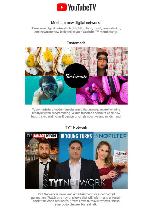 On Thursday, YouTube TV alerted customers by way of email it had added new channels Tastemade and TYT, along with Cheddar and Cheddar Big News, which arrived earlier.