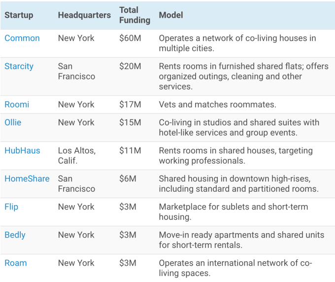 Notice any commonalities? Yes, the startups listed are all based in either New York or the San Francisco Bay Area, two metropolises associated with scarce, pricey housing. But while these two metro areas offer the bulk of startups’ living spaces, they’re also operating in other cities, including Los Angeles, Seattle and Pittsburgh.