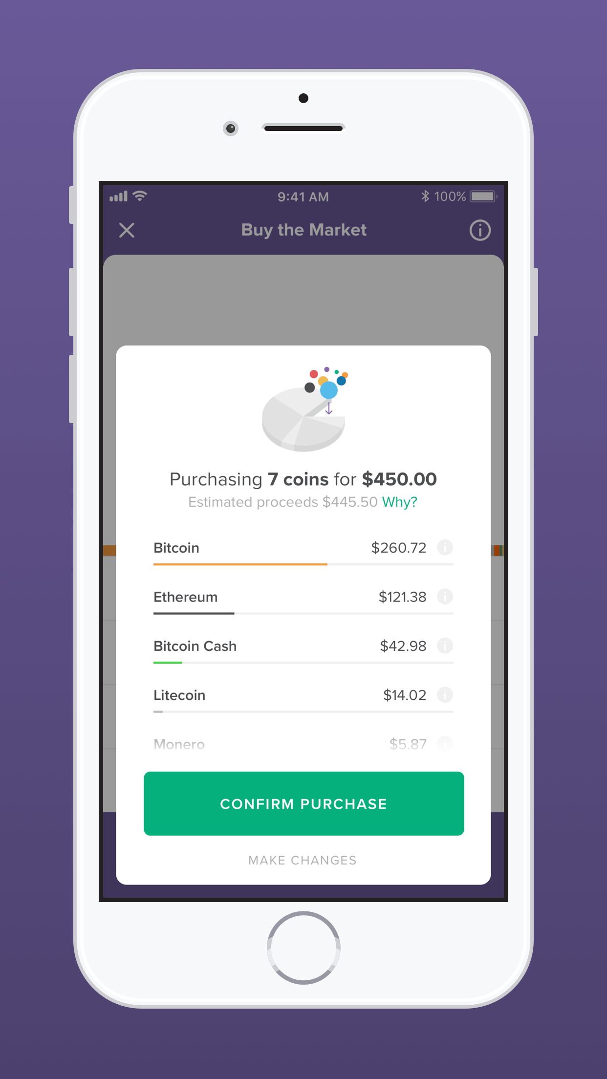 That’s why Circle has created a button that lets you buy all coins available on Circle Invest, weighted depending on their respective market capitalization. The total market cap of Bitcoin is much higher than the total market cap of Zcash, so you’ll end up with more Bitcoin than Zcash.