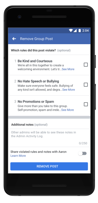 The first will allow admins and moderators to notify a member whose post gets pulled down which group rule they broke that caused its removal. They’ll also be able to collaborate with other admins and moderators by adding notes in an activity log when they remove a post.