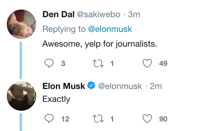Elon Musk has, as I imagine he often does during meetings or long car rides, come up with an idea for a new thing. Unlike the Hyperloop, which was cool, and various space-related ideas, which we know he’s at least partly expert about, this one is just plain bad. It’s basically Yelp But For Journalism.